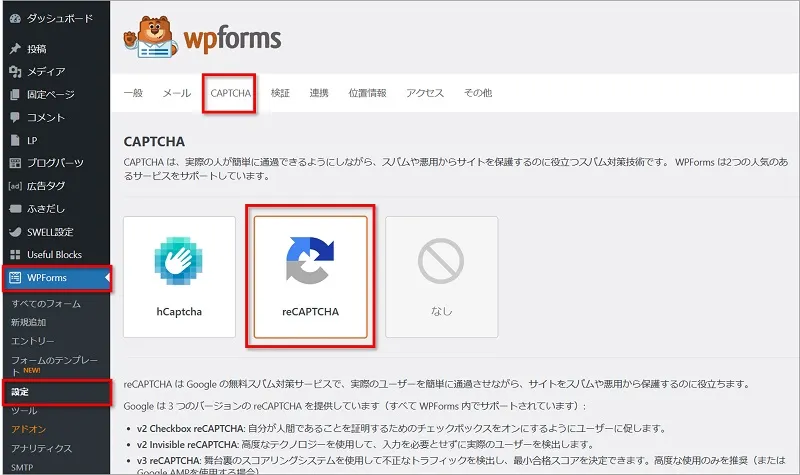 WordPressの画面から、「WPForms」⇒ 「設定」⇒ 「CAPTCHA」の順にクリックし、「reCAPTCHA」を選択します。