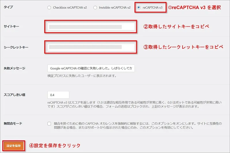 3. シークレットキー:reCAPTCHAページで取得したシークレットキーをコピペします