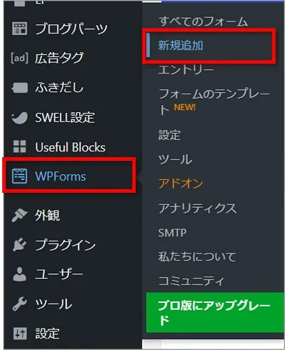 「WPForms」⇒「新規追加」の順にクリックします。