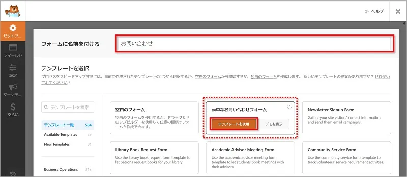 フォームに名前を付けるの欄に「お問い合わせ」と入力し、簡単なお問い合わせフォームの「テンプレートを使用」をクリックします。