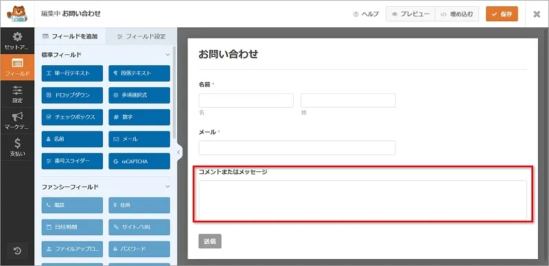 このままでも十分なのですが、今回は「コメントまたはメッセージ」を「メッセージ」とだけ表示されるように編集してみます。